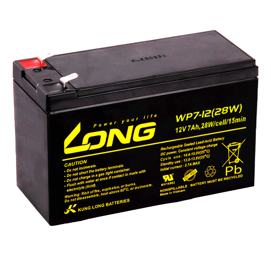 Bateria LONG WP7-12 28W com pequeno volume, peso leve e de descarga de alta eficiência. Ideal para ser usada em nobreaks, alarmes e outros equipamentos que necessitem de baterias de 12V com até 5 Ah